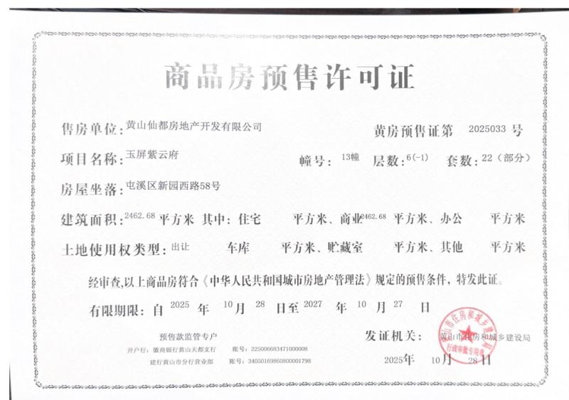 商品房预售许可公告-玉屏紫云府13幢(2025033)