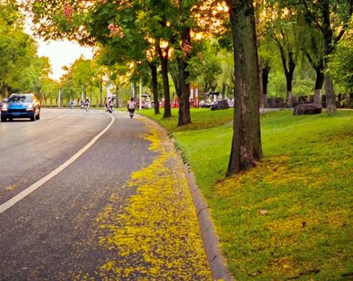 细密的小黄花缀满枝头又铺了满地,星点红蕊镶嵌其间,将整条路都映衬得鲜活明丽起来。
