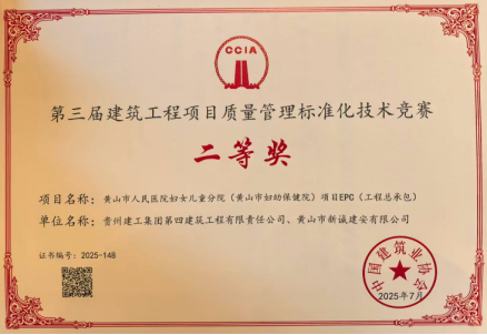 近日,由黄山市新诚建安有限公司联合贵州建工集团第四建筑工程有限责任公司承建的黄山市人民医院妇女儿童分院(黄山市妇幼保健院)EPC项目,在第三届建筑工程项目质量管理标准化技术竞赛中荣获二等奖。该奖项由中国建筑业协会组织评选,是全国建筑行业质量管理领域的权威赛事。